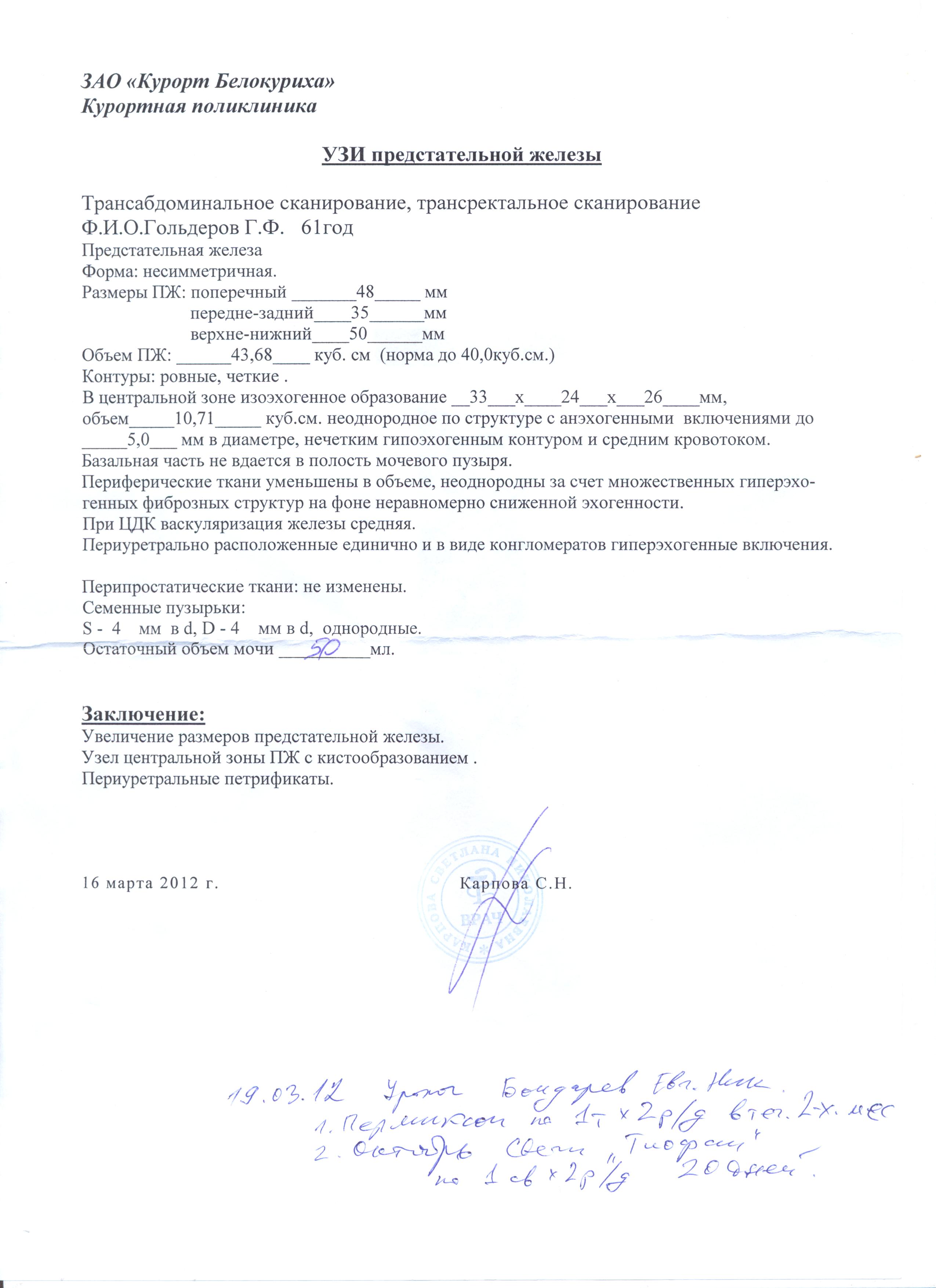 Здравствуйте! Мне 62 года. Наличие простатита обнаружено более 5 лет назад.В марте этого года на курорте Белокуриха сделал УЗИ и на УЗИ дополнительно выявилась ещё и аденома. См.приложение "Выписка УЗИ". Субьективно:относительно частое мочеспускание,ослабленная струя, чувство неполного опорожнения пузыря. Эрекция есть, но не такое крепкое (как хотелось-бы)...По рекомендации врача пропил "Пермиксон" 2 месяца, улучшение было. По той-же рекомендации, в сентябре буду "принимать" свечи "Тиофан".Живу в Якутии, в середине октября проездом буду в Новосибирске.Хочу у Вас быть на приеме, по крайней мере сделать УЗИ и получить рекомендации по лечению.Это конечно мои минимальные планы, краткие по времени нахождения в Н-ске. У меня вопрос: по моему "рассказу" и по заключении УЗИ, что Вы можете сказать, на сколько дней мне рассчитывать находиться в Н-ске, если потребуется полечиться непосредственно у Вас? Спасибо за любой ответ!